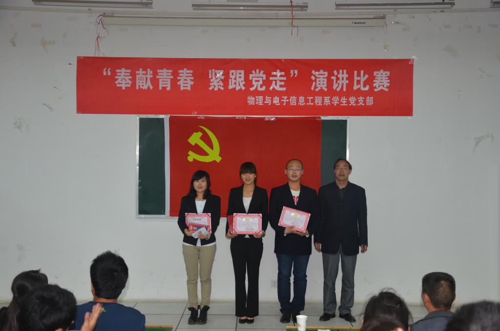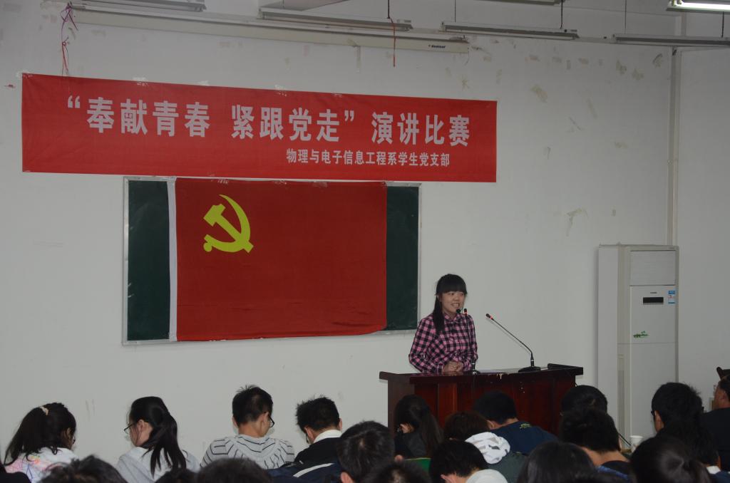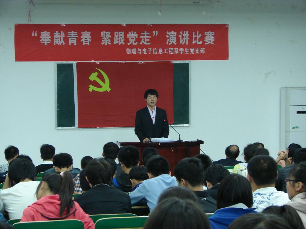 4月18日晚,物理与电子信息工程系员工党支部在报告厅1举办了以“奉献青春紧跟党走”为主题的演讲比赛,物理与电子信息工程系党总支书记张秦中、党政办公室主任杨延锋、党总支委员侯茹、团总支书记陈倩、辅导员魏书灵和李磊老师出席并担任评委,比赛由刘伟、宋丹主持,200余名员工参加。