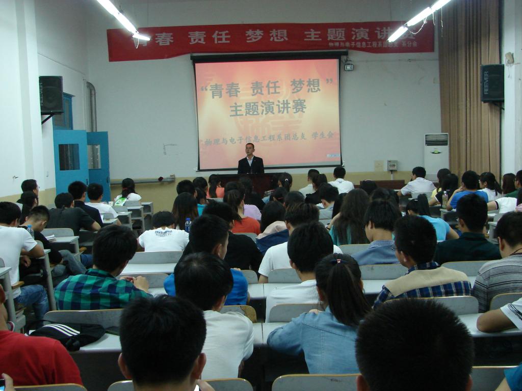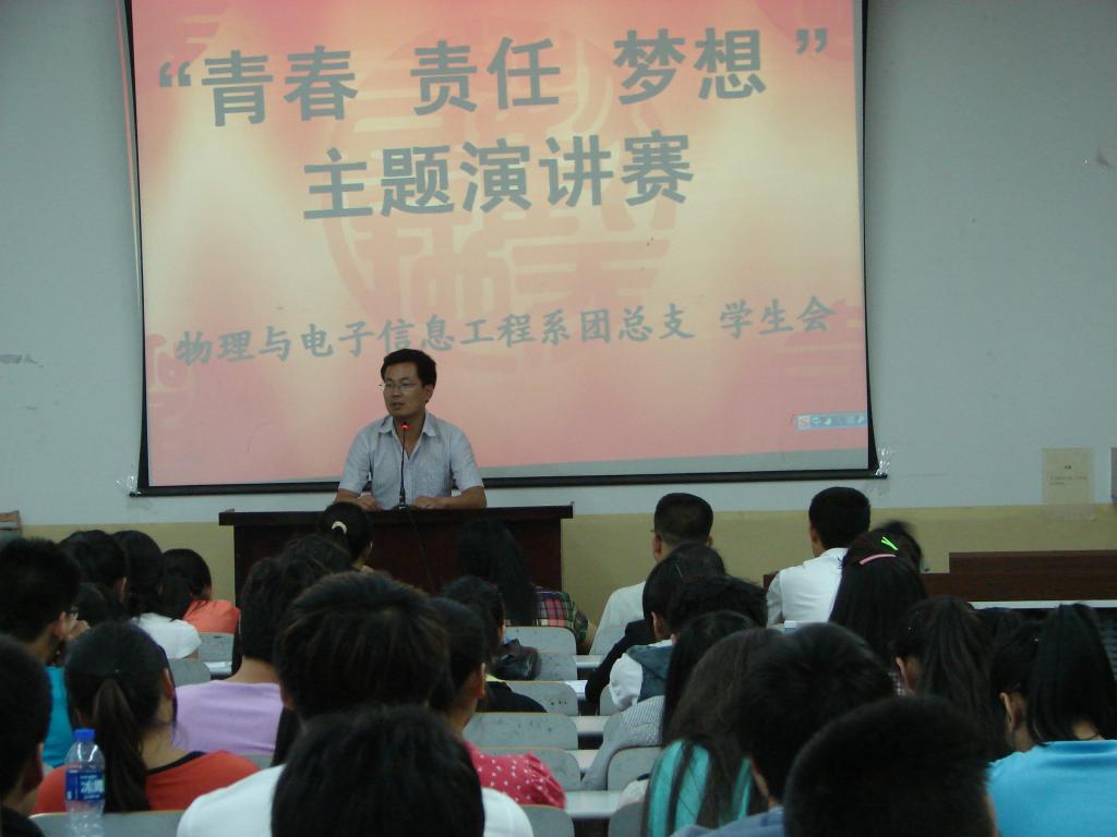 6月5日晚,物理与电子信息工程系在多媒体17举办了以“青春 责任 梦想”为主题的演讲比赛,物理与电子信息工程系党总支书记张秦中、团总支书记陈倩和辅导员魏书灵、李磊以及杨琳、王博、谢谦老师出席并担任评委,近200余名员工观看了比赛。