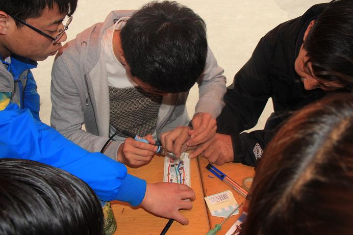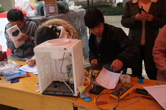 17日上午8时,家电义务维修志愿者就开始在小角楼布置场地,并将维修工具有序的摆放在桌子上。准备工作完毕后,陆续有同学和老师拿着维修物来到活动现场,大到饮水机、音箱,小到耳机、台灯,志愿者都一一登记下来。负责维修的同学遇到问题可以运用专业知识,积极的讨论并解决,维修工作井然有序。截至19日,共收到维修物品一百多件,维修成功率达到了90%以上,扎实的专业技能得到了广大师生的一致认可。