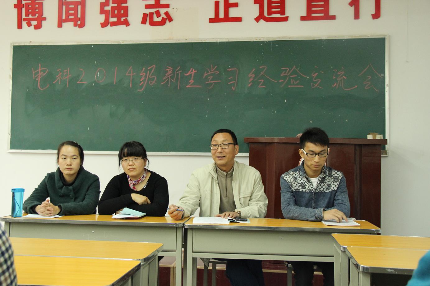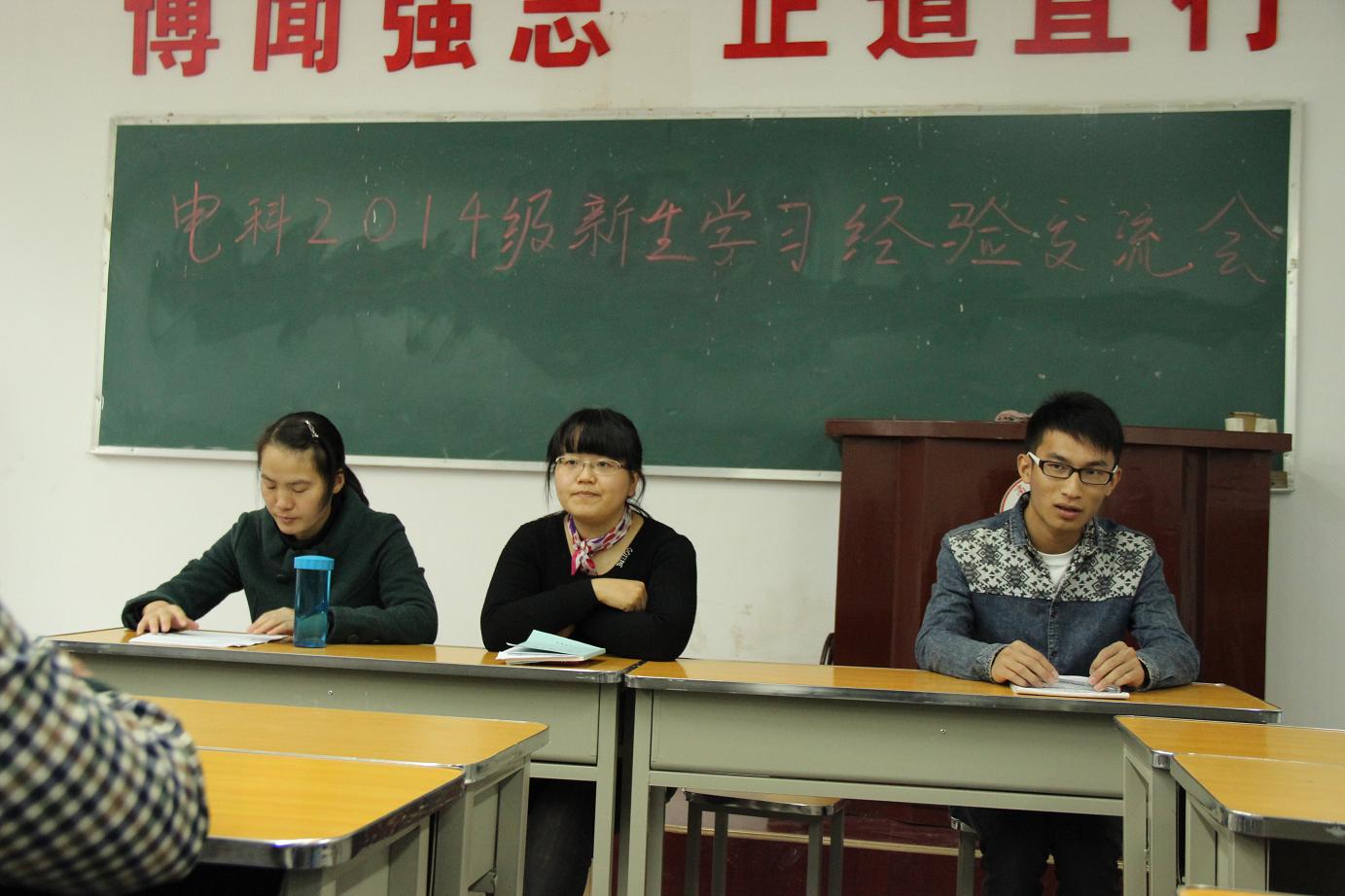 以上图片为:电子信息科学与技术专业召开2014级1-2班新生学习经验交流会现场