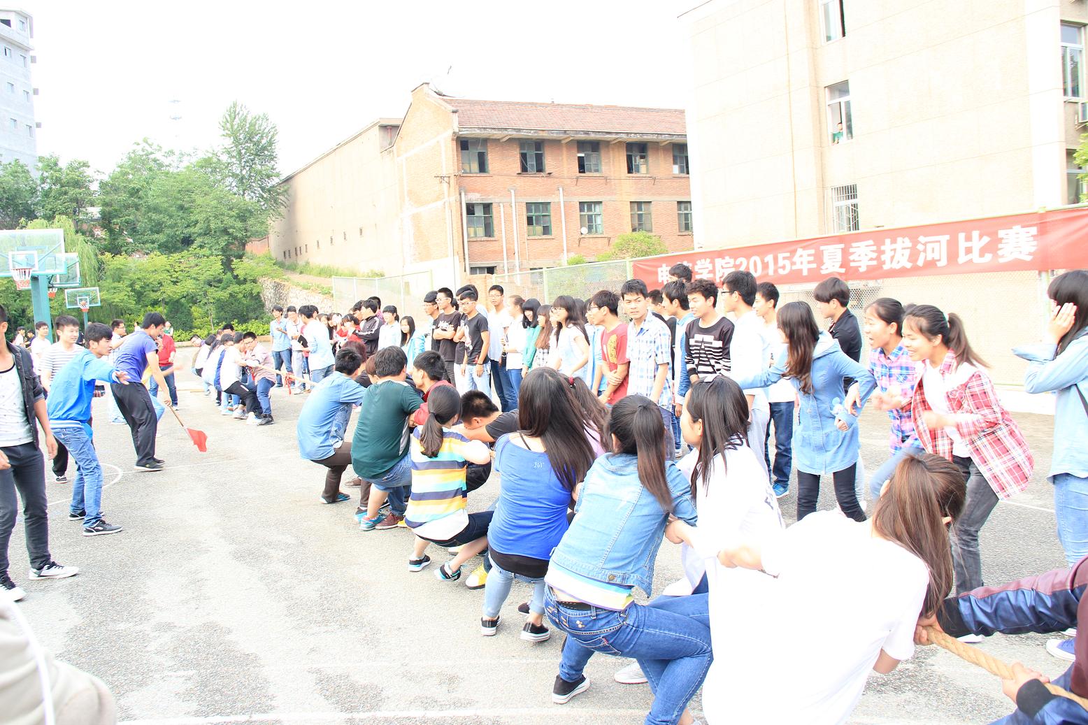 参加本次比赛的有2013级、2014级各班同学分别组成的7支队伍,每队14人男女混搭进行参赛。下午四点,比赛正式开始,比赛场上只见参赛的同学们精神抖擞,一个个相互鼓励,脸上闪动着坚定的神情。随着哨声响起,队友们喊着“一二,一二”的口号向自己方向拼命拉绳。同学们也自发的组成拉拉队为各班同学加油。赛场上欢呼声,呐喊声此起彼伏,处处散发着青春的气息,整个场面激烈而温馨,团结协作的力量在一条长绳之间传递。