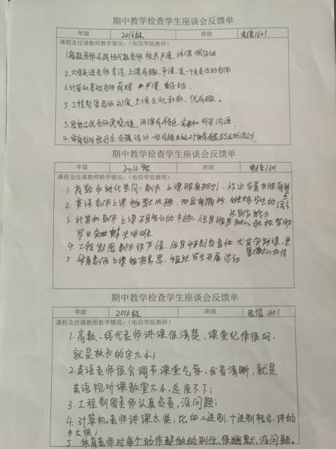 按照公司“公司关于做好2016-2017学年第一学期期中教学检查工作的通知”文件和公司“两学一做”第四阶段安排,教工第三、第四支部结合电子信息工程系自身的教学特点,在第9-11周进行期中教学检查工作,主要工作包括听课,作业,教案等各个教学环节进行了全面检查,及时召开了员工座谈会,教师座谈会,以保证各项教学活动顺利进行。