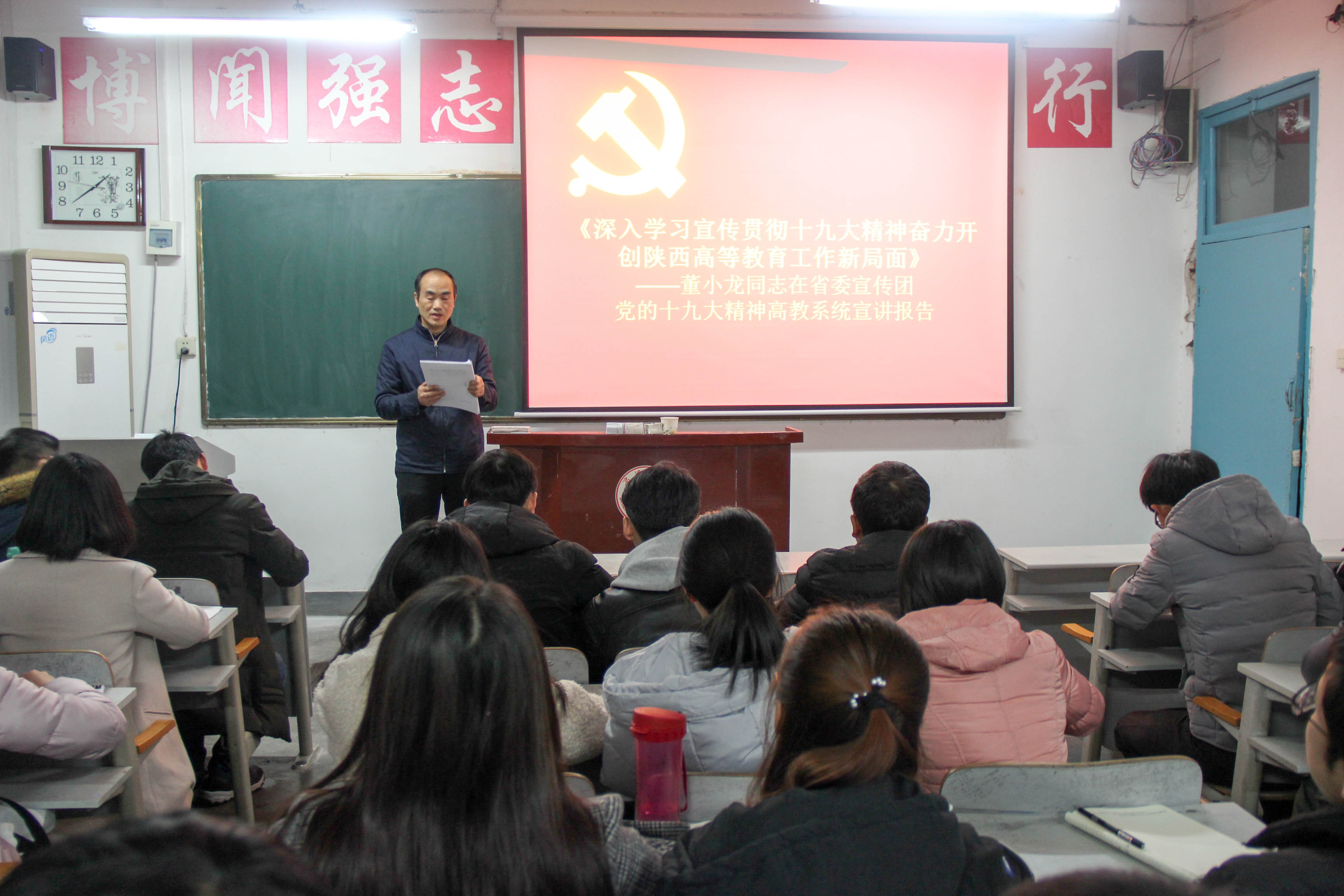 李英同志以省委宣讲团成员、省委高教工委书记董小龙的宣讲提纲为主要内容,从深刻领会十九大的主题、习近平新时代中国特色社会主义思想、十八大以来党和国家事业发生的历史性成就和变革、我国社会主要矛盾的变化、“两个一百年”奋斗目标的战略部署、我国经济社会发展的战略部署、以及坚定不移推进全面从严治党的战略部署等八个方面详细地讲述了十九大的报告精神,全体员工党员认真聆听并做好学习记录。