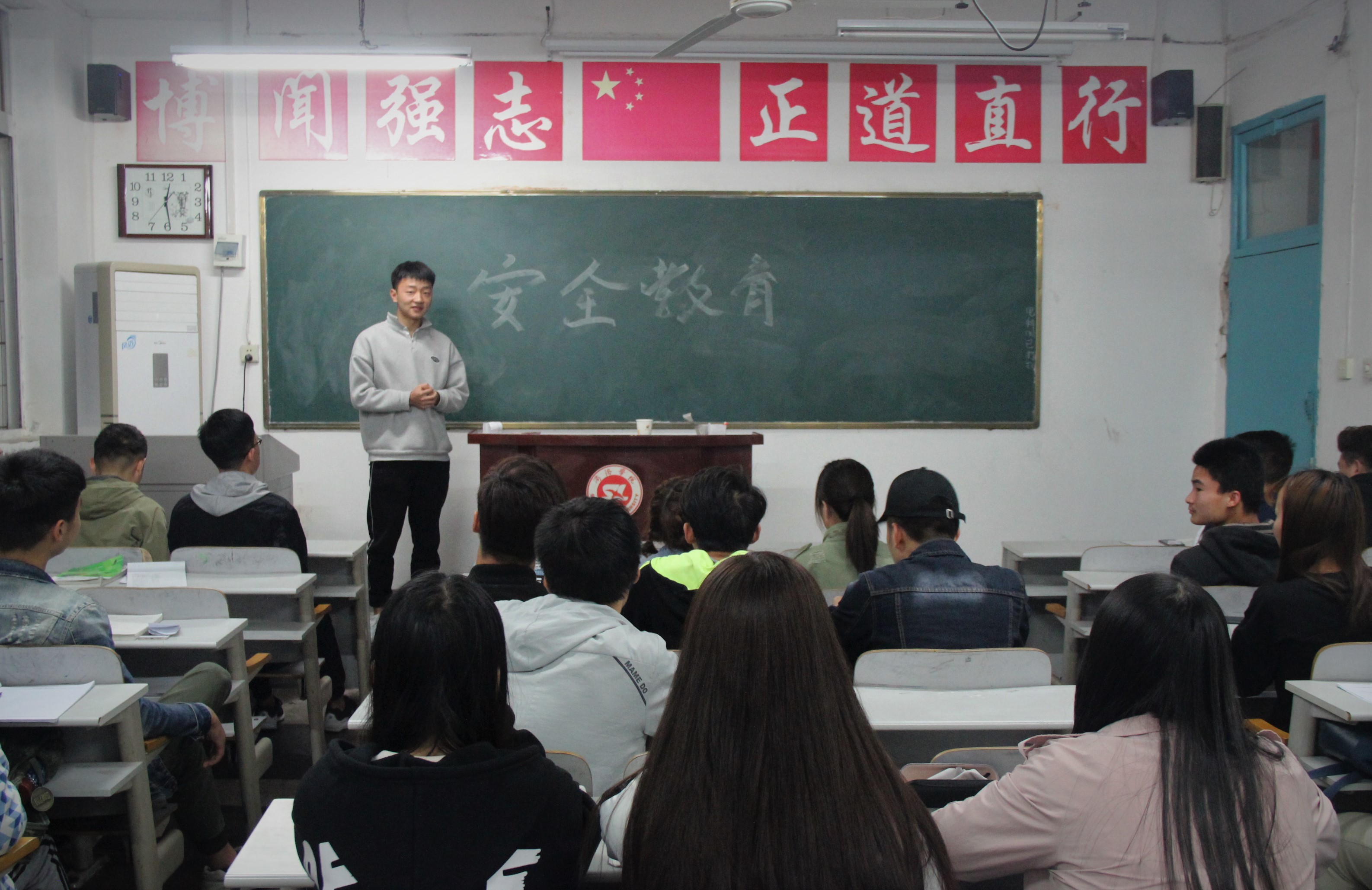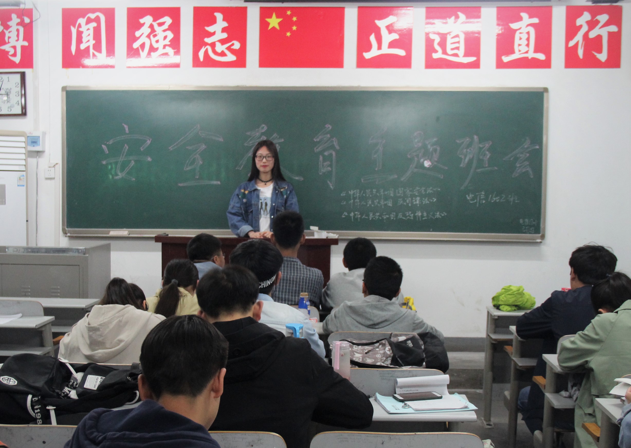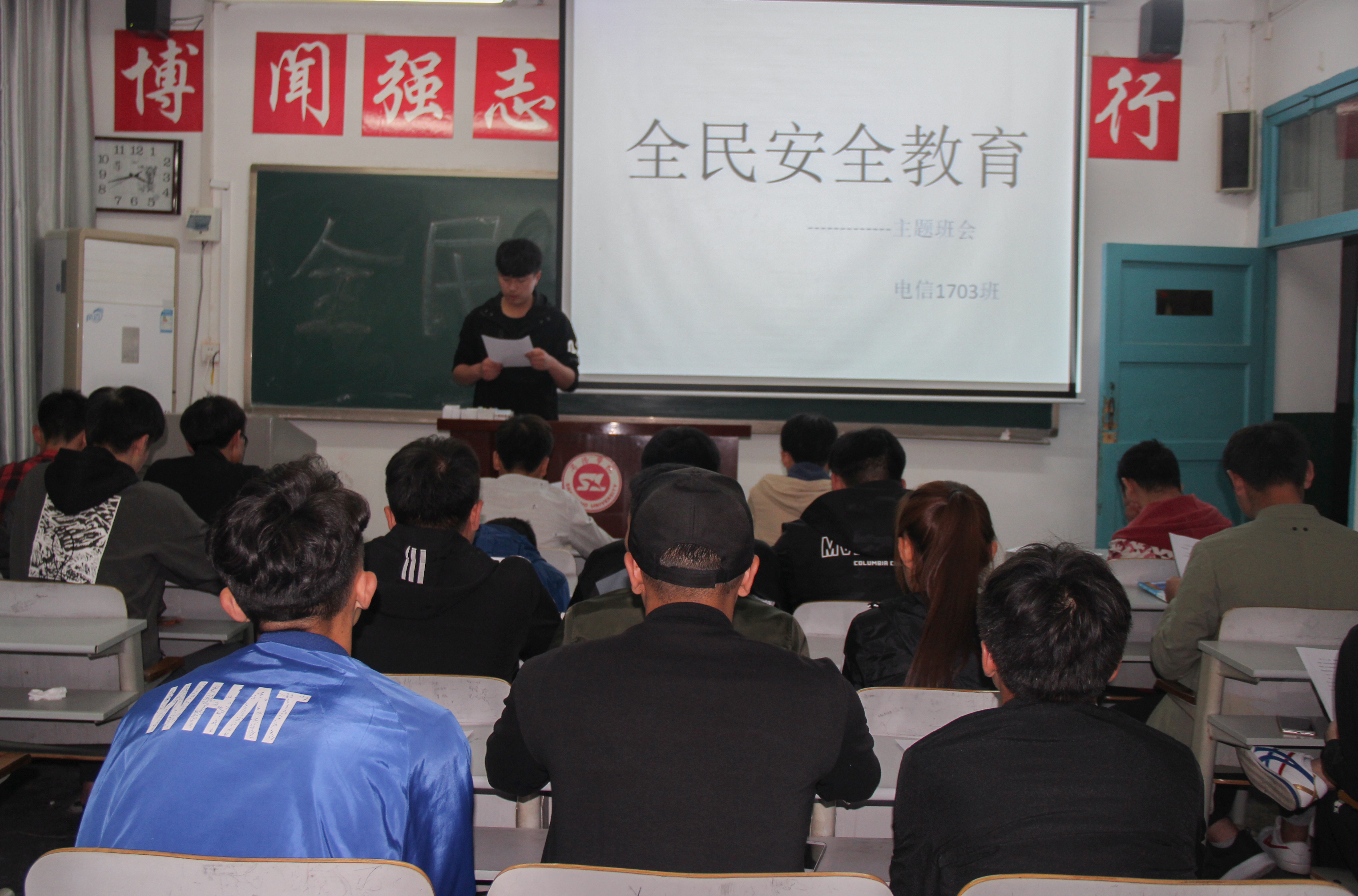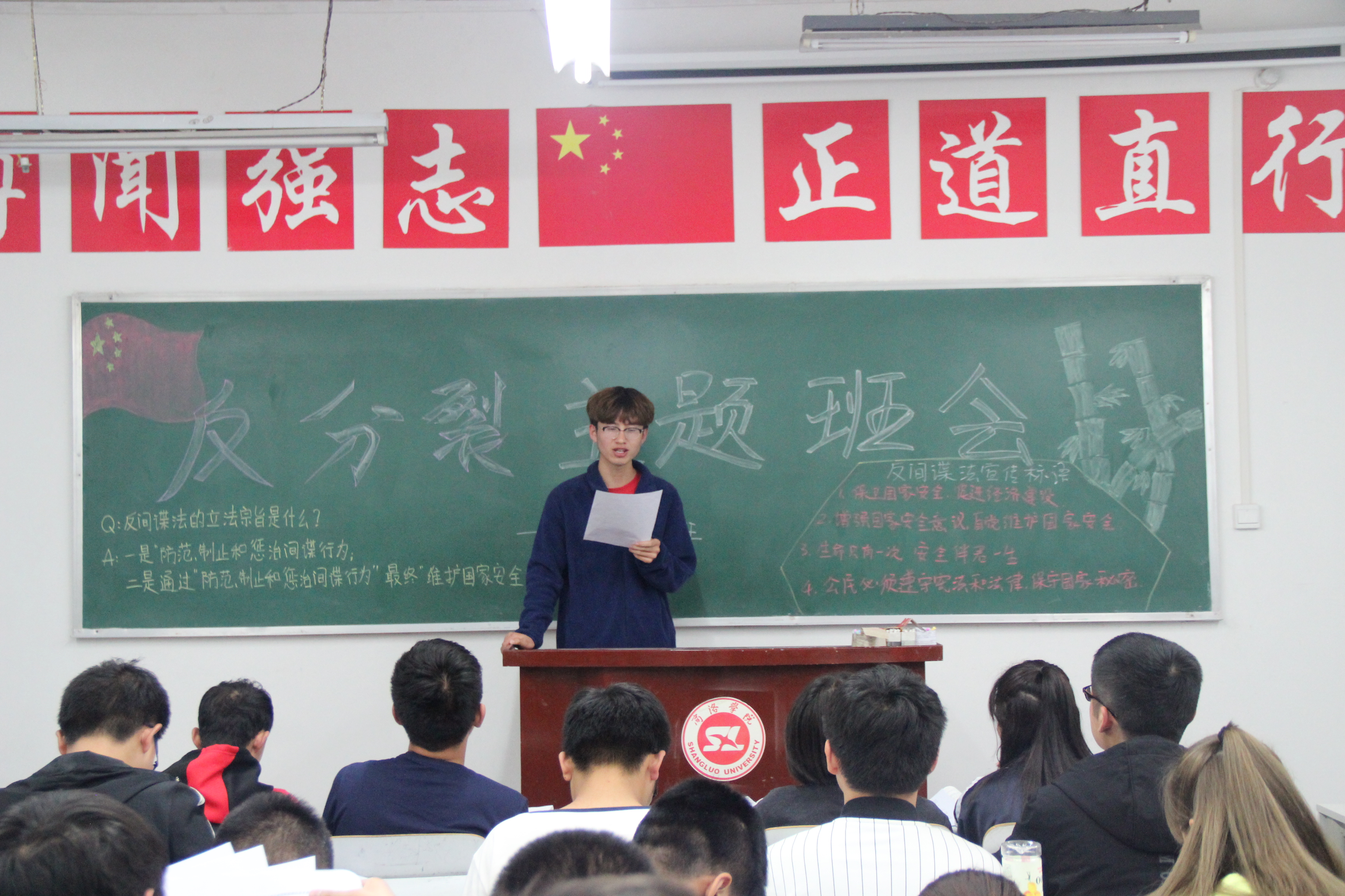 主题班会以此次宣传活动为契机,借周末班会时间,由各班班长组织各班同学学习《中华人民共和国国家安全法》《中华人民共和国反间谍法》《中华人民共和国反恐怖主义法》。班会过程中各班班长结合班级自身情况,采取制作PPT,宣读文件,制作主题板报等多种方式宣传三部法律,便于同学们接受和理解此次活动的主题,营造“国家安全 人人有责”的浓厚氛围。