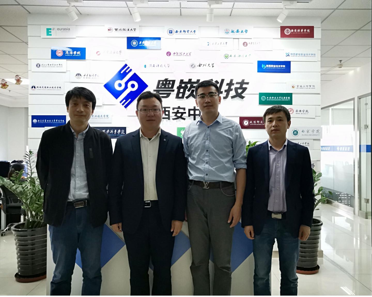 4月30日,beat365英国官网网站经理袁训锋、副经理陈垚、教师何建强赴西安粤嵌科技公司洽谈校企合作事宜,总经理王乐忠和校企合作总监高博龙热情接待了来访教师。