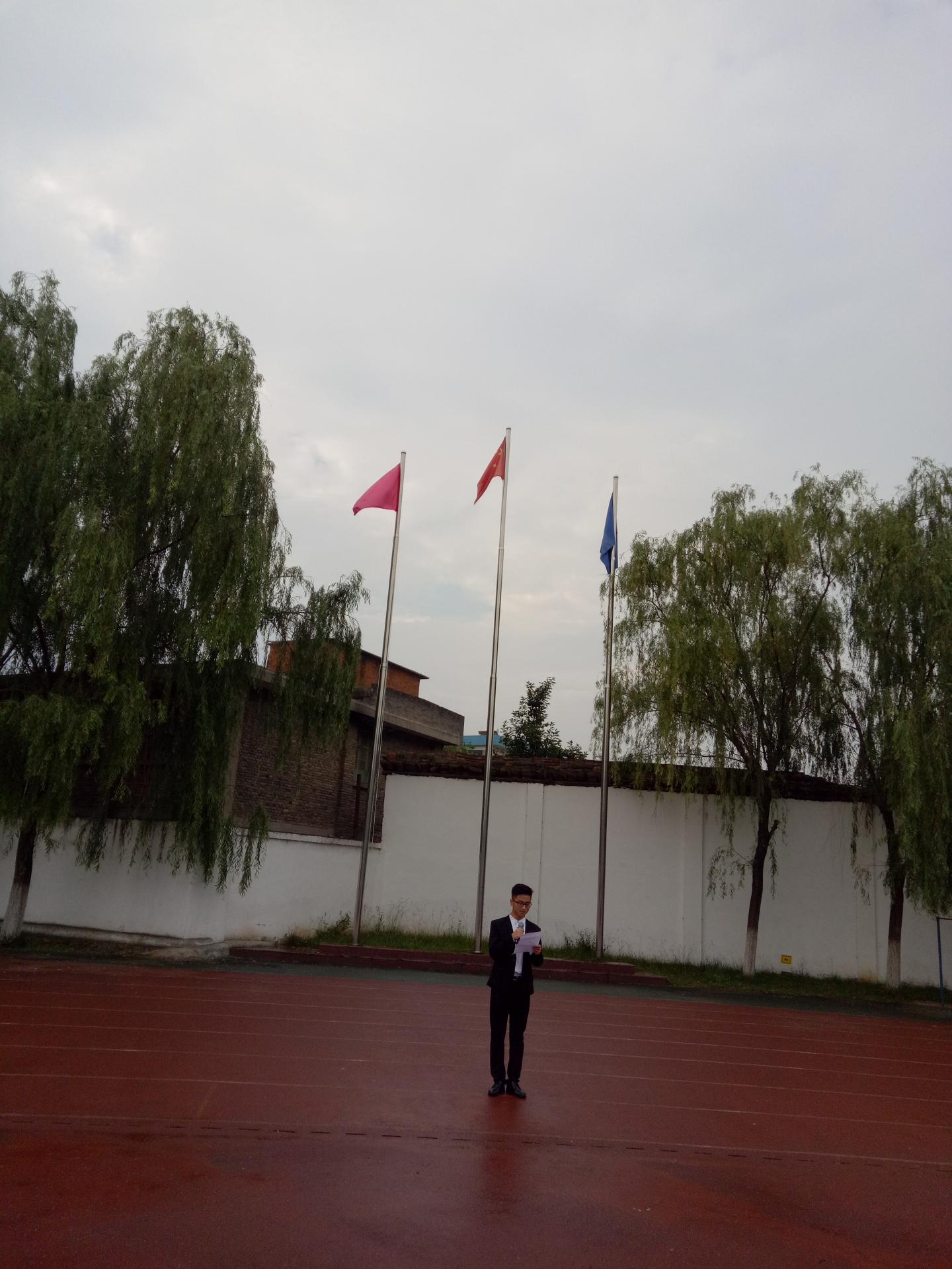 6月24日早,beat365英国官网网站以“绿色发展,节能先行”为主题举行第十八周升旗仪式。6点40的时候,尽管天空下起了凉雨,但是beat365英国官网网站院领导及全体师生风雨无阻,继续参加升旗仪式。升旗仪式由电信1702班陈曜晖主持。