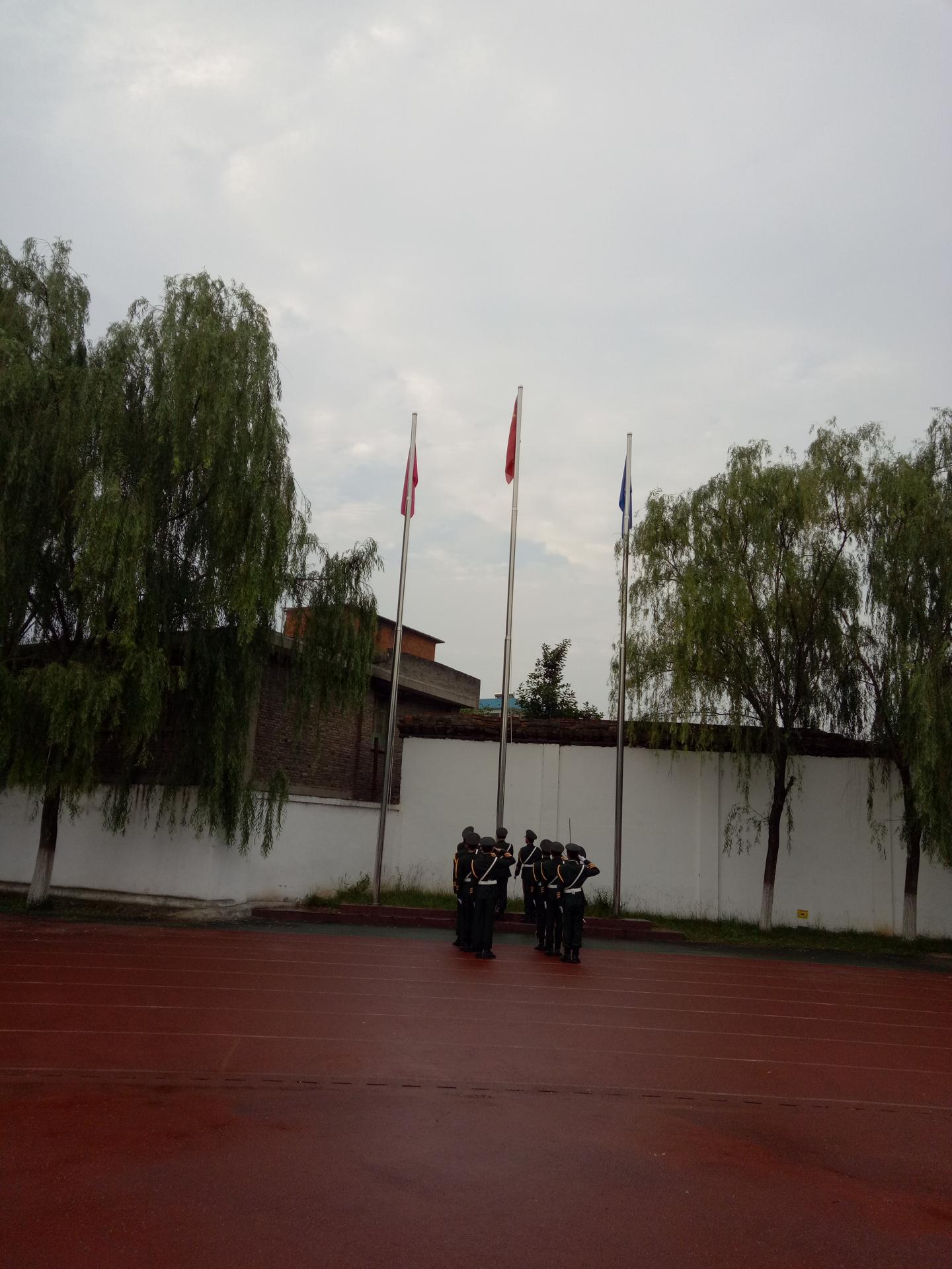 伴着丝丝凉风,国旗护卫队队员踏破清凉的雨水,在嘹亮的口号声中护送国旗至升旗台前,在庄严的国歌声中,五星红旗在全院师生的注目礼下冉冉升起。雨中升国旗,展现出公司师生的坚定信念和满腔的爱国爱校热枕。