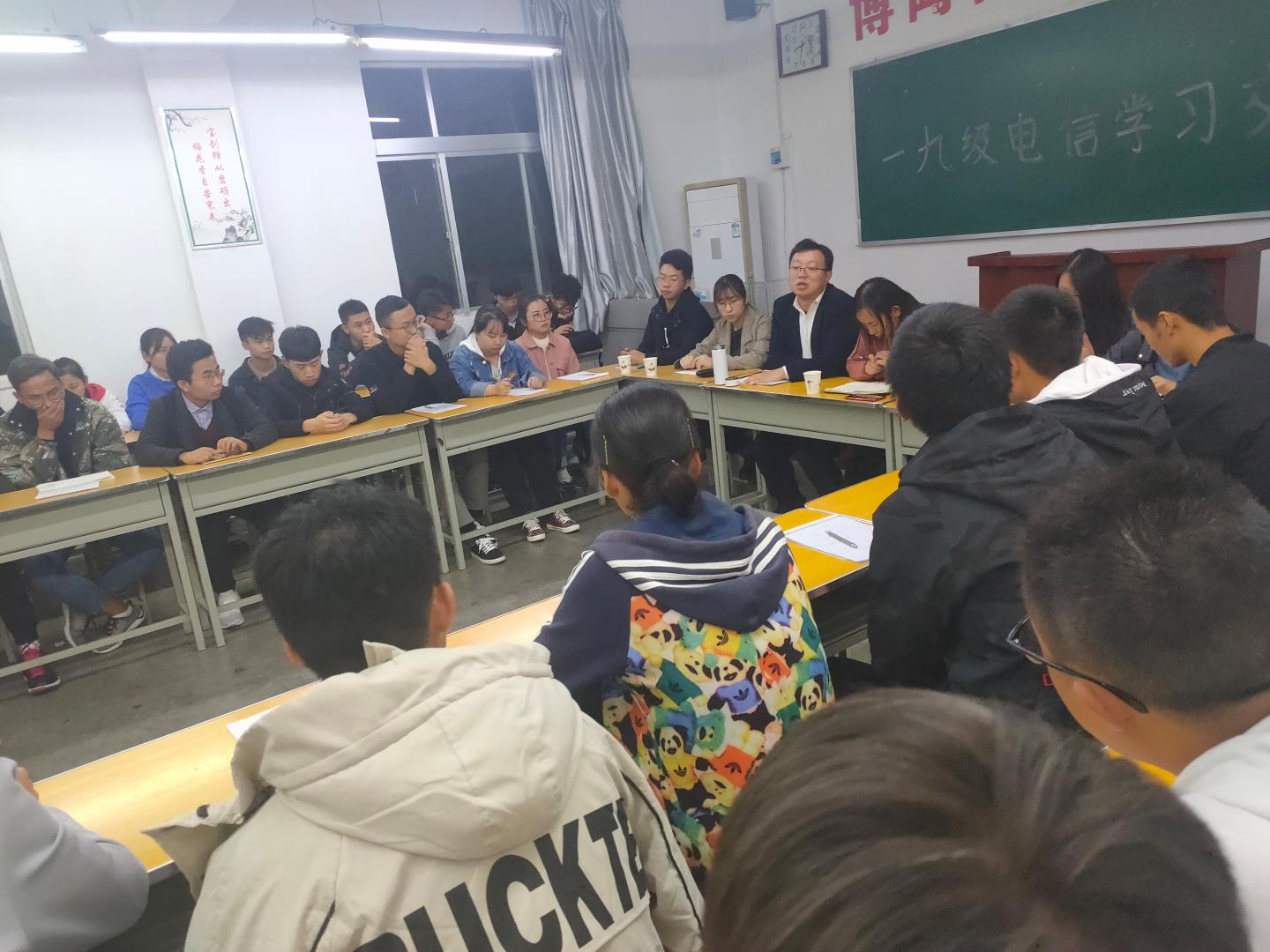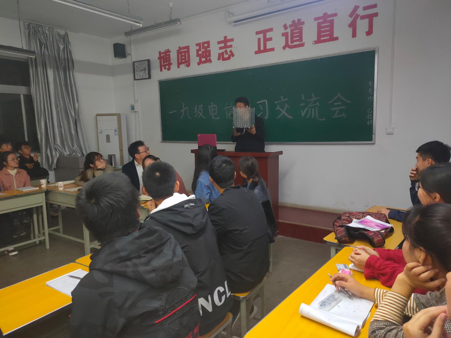 11月3日晚,beat365英国官网网站在2号楼210教室组织召开2019级电子信息工程专业学习经验交流会。会议由电信1902班主任袁训锋老师主持。电信1901班主任张娜老师出席会议。电信2017级巩若琳、李娜、杨化俊和2018级王磊等4位高年级同学受邀参加学习经验分享,电信1901、1902全体同学参加会议。