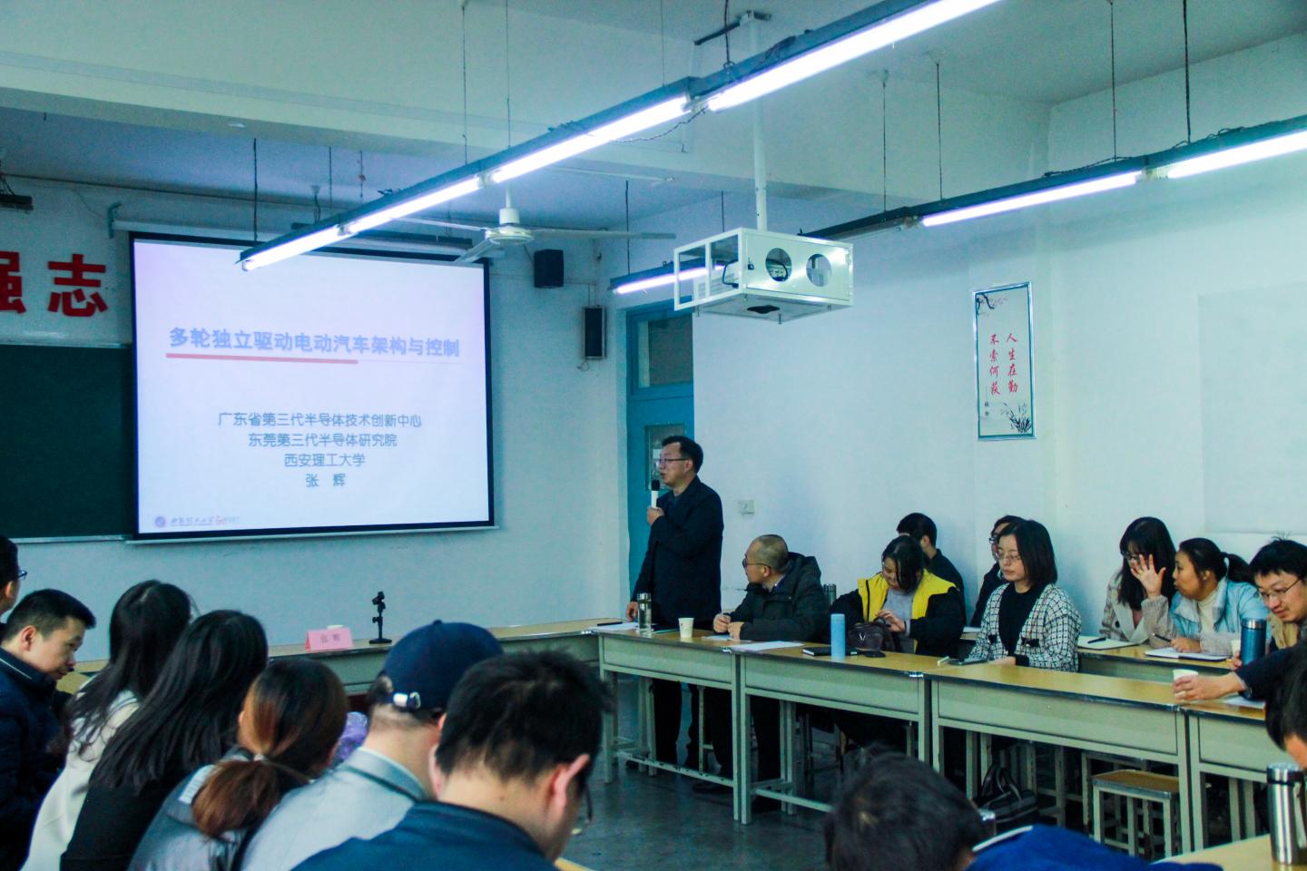 报告会上,张辉教授结合自己(团队)的科研项目,讲解了独立驱动电车的研究意义和背景、多轮独立驱动架构和控制等内容;结合新能源汽车发展规划,系统分析了电动汽车发展面临的主要课题,并就电动汽车的驱动、转向、充电等技术进行了系统讲解。报告会结束后,张教授与电气专业教师就团队建设、人才培养、科学研究等领域进行了深入的交流互动。