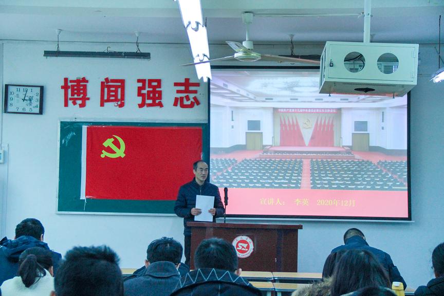 为深入学习贯彻党的十九届五中全会精神,12月8日下午,beat365英国官网网站于2号楼210教室举办学习贯彻党的十九届五中全会精神专题党课。党总支书记李英担任主讲人。全体教工党员参加了本次会议。