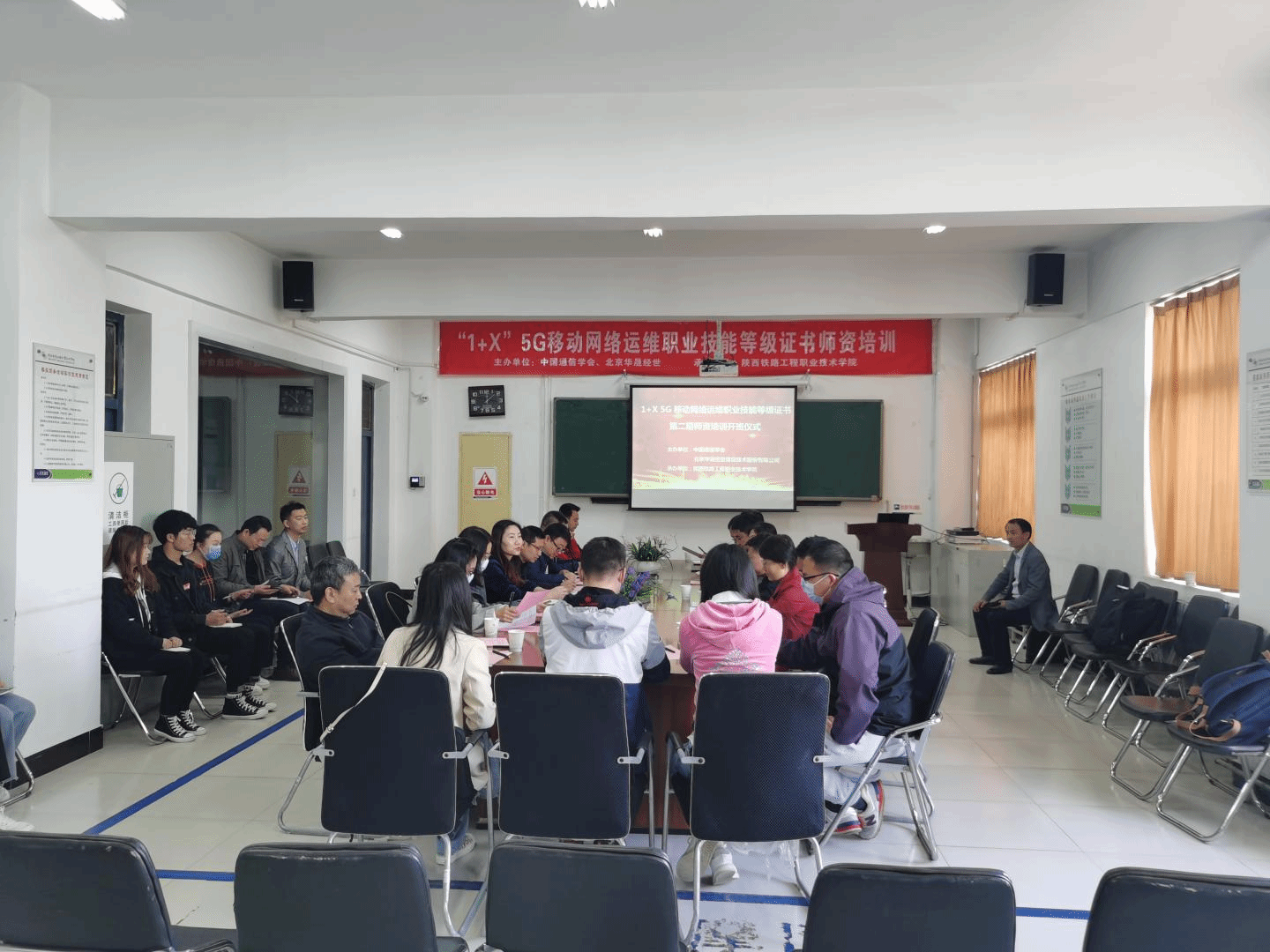 4月19日上午,由中国通信学会、北京华晟经世信息技术有限公司主办,铁道运输公司承办的全国“1+X”5G移动网络运维职业技能等级证书2021年第二期线下团队培训在临渭校区S206开班,为进一步加强公司实施1+x证书经验和学科前沿研究工作,提高员工获得证书率,公司教师代表邢笑笑前往陕西铁路工程职业技术公司培训。