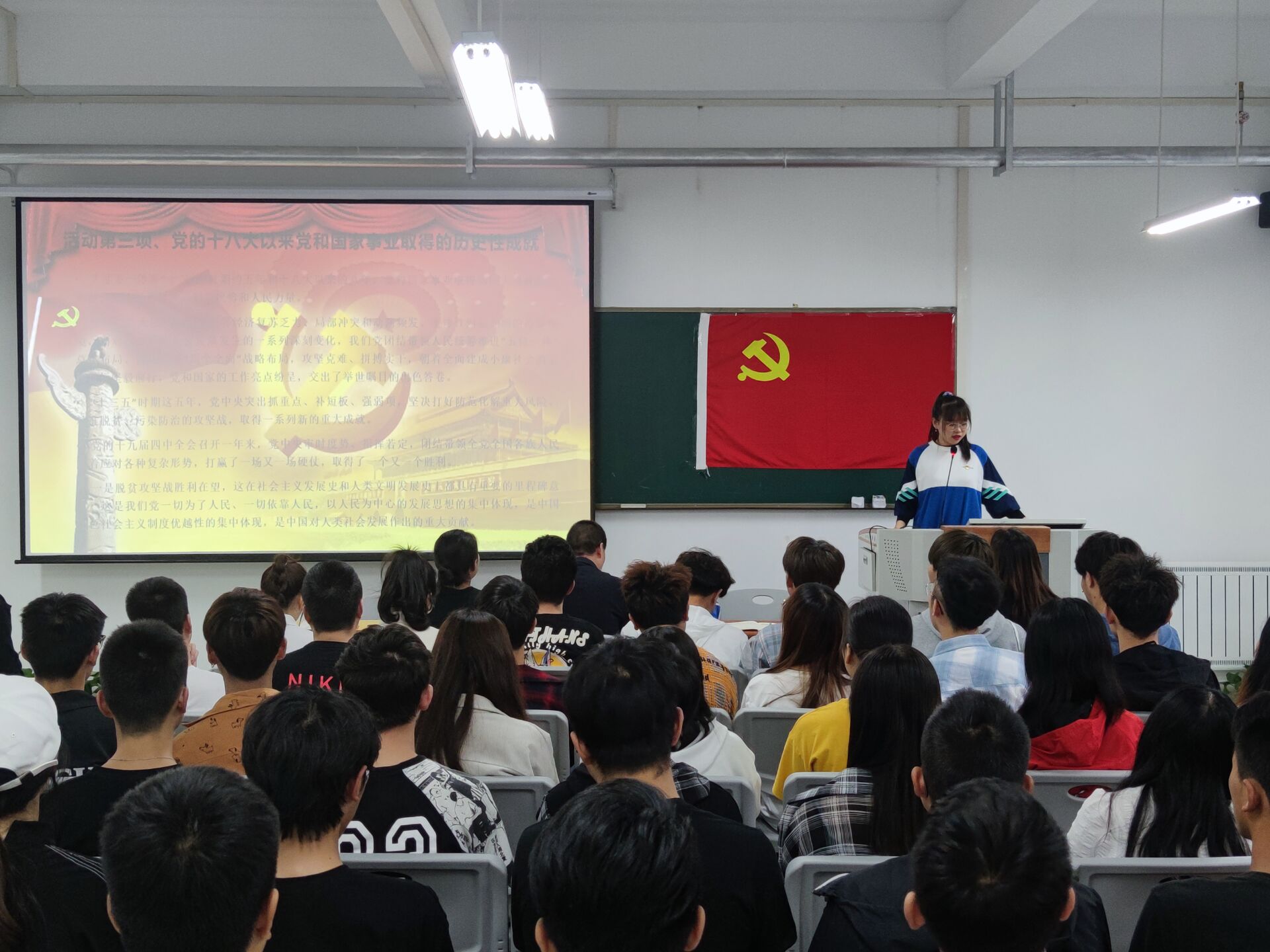 活动开始,全体肃立,奏唱国歌。接着全体积极分子共同观看了《党的发展历程》短片,通过视频了解党的发展历程,感悟波澜壮阔的百年党史。第三项由赵乙泽同志带领大家重温党的十八大以来党和国家事业取得的历史性成就,让我们坚信,中国特色社会主义的航船劈波斩浪、勇往直前。第四项由李晓婷同志带大家学习并深刻领会党的性质宗旨,观看视频学习发扬红色传统、传承红色基因。