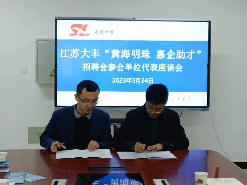 3月24日,beat365英国官网网站在丹江校区3-312会议室举办江苏大丰“黄海明珠 惠企助才”招聘会参会单位代表座谈会,盐城大丰区人社局陈飞主任、相关企业代表、beat365英国官网网站副经理李亚文和全体毕业班辅导员参加座谈,会议由党委书记赵永平主持。会上,双方就“校企合作 共同发展”展开深入交流,公司党委书记赵永平与盐城大丰阿特斯阳光电力科技有限公司代表现场签订就业创业基地协议并授牌。随后,大丰区人社局陈主任及用人单位代表在丹江校区1-102报告厅开展专场招聘宣讲,beat365英国官网网站百余名毕业生积极参会并投递简历,现场反响热烈。