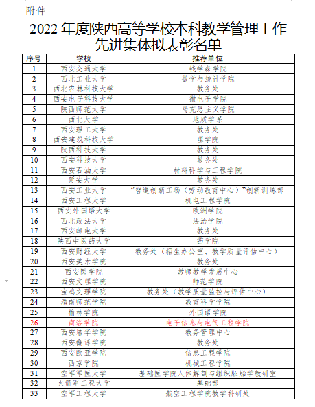 中共陕西省委教育工委、陕西省教育厅下发了2022年度全省教育系统表彰文件,公司beat365英国官网网站被评为“2022年度陕西高等公司本科教学管理工作先进集体”。