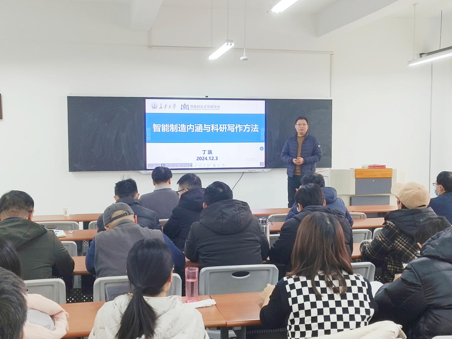 丁凯教授,作为智能制造领域的知名专家,其研究成果在数字孪生、工业物联网、人机协同等领域具有广泛影响。在报告中,丁教授首先介绍了智能制造的基本概念、发展趋势及其在工业生产中的应用,随后,他结合自己的科研经历,详细讲解了科研写作的方法和注意事项,为在场的师生们提供了宝贵的学术写作指导。参会师生对丁教授的报告表现出极高的兴趣,提问环节积极互动,针对智能制造的技术细节和应用前景进行了深入探讨。