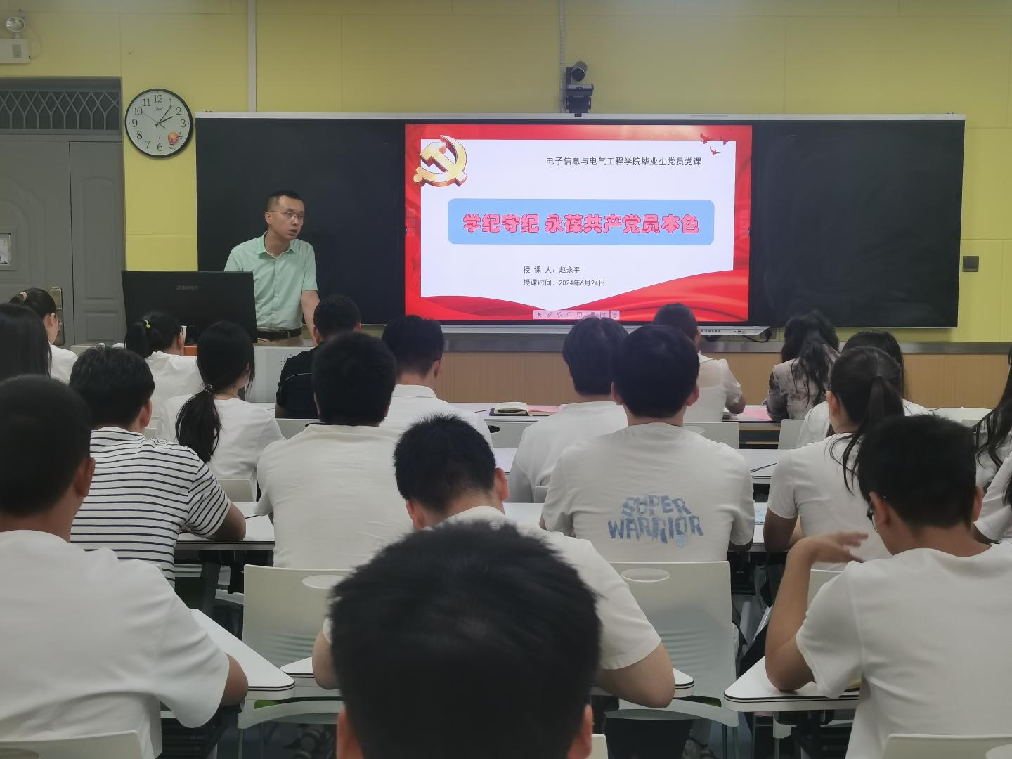 聆听一堂纪律党课,筑牢思想防线。赵永平结合党纪学习教育,为全体毕业生党员作主题为《学纪守纪 永葆共产党员本色》的纪律党课。他围绕新版《中国共产党纪律处分条例》,重点讲述了《条例》修订背景、主要内容和新增亮点,要求毕业生党员时刻在思想上筑牢防线,防微杜渐,警钟长鸣,注意从小事做起,“勿以善小而不为,勿以恶小而为之”,做到堂堂正正做人,清清白白做事;在行动上,要遵守纪律,严格管理,以自己的实际行动赢得身边群众的口碑、信任和拥护。