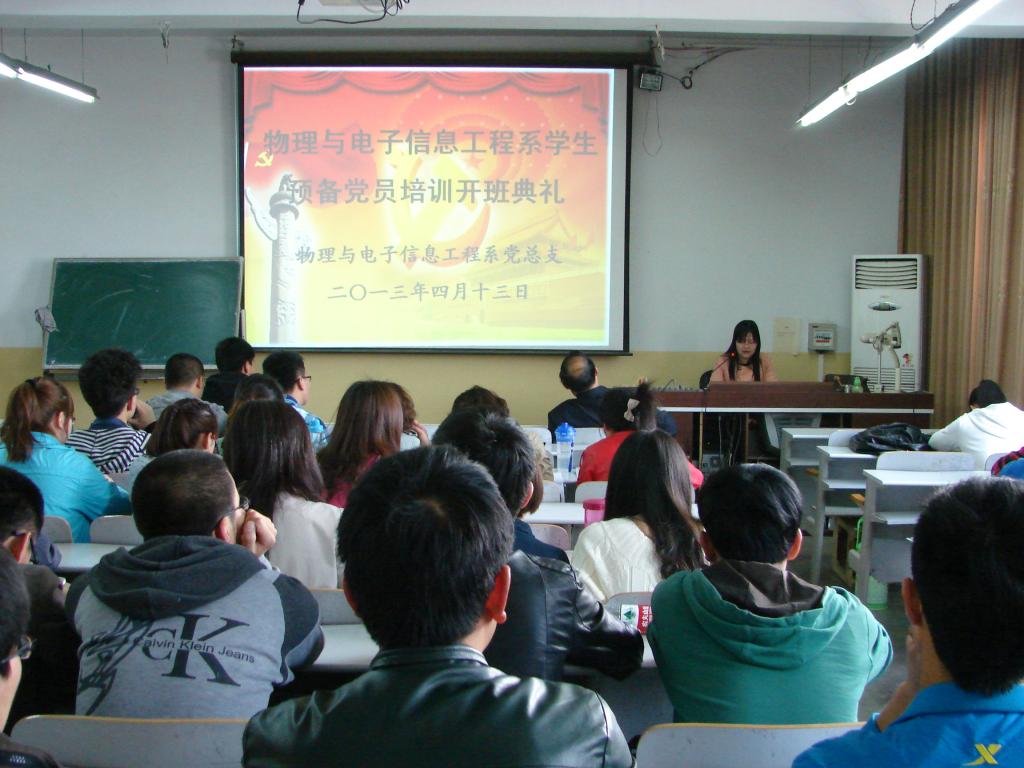 为加强党性修养,充分发挥党员模范带头作用,物理与电子信息工程系员工党支部在4月13—14日开展了预备党员教育培训活动,参加培训的预备党员共73人。