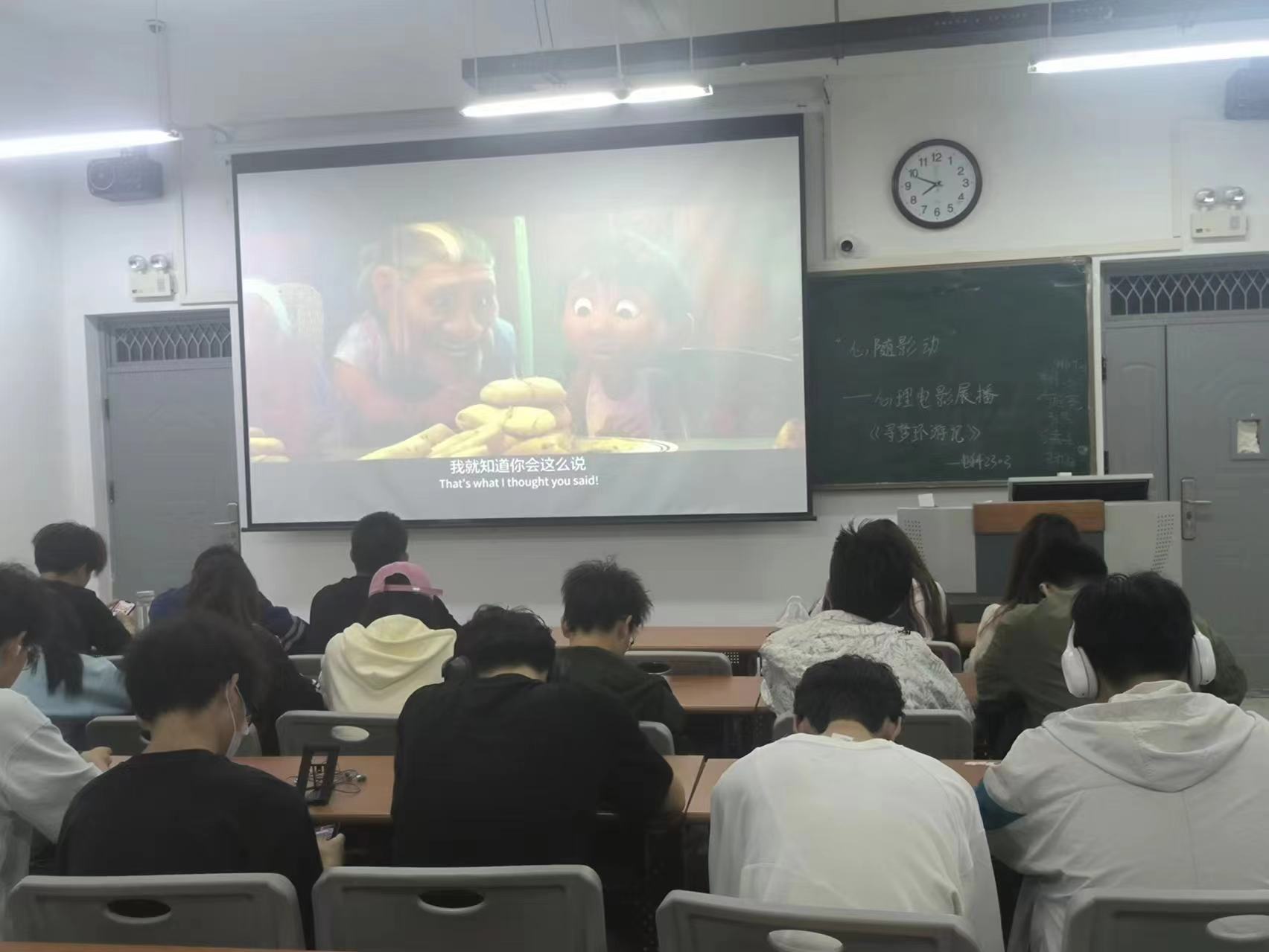 电影《寻梦环游记》是有关亲情,梦想,人生,死亡,爱与被爱的一部电影,它通过瑰丽的画面与奇幻的想象,温暖的导向与感人的情节,讲述了热爱音乐的小男孩米格和落魄乐手埃克托在五彩斑斓的神秘世界里开启的一段奇妙冒险旅程的故事。这部电影带领同学们感受了死亡和生命的联系和内在不曾发现的意义,使同学们在忙碌的生活中有一段闲暇放松的时光,真正静下心来体验电影情节所带来的愉悦和思考,让大家能够得到自我的救赎和升华。